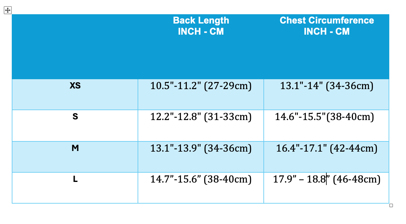 • XSmall: Chest 13.1"-14" (34-36 cm) | Back length 10.5"-11.2" (27-29 cm)